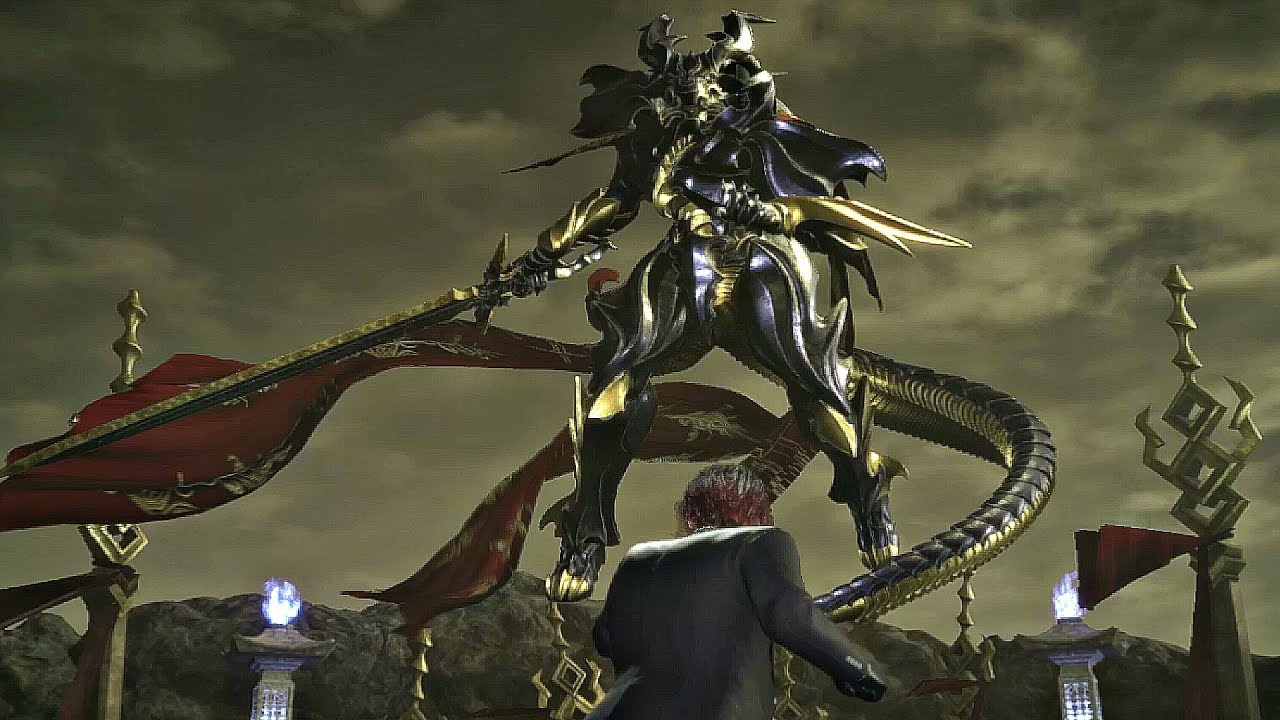 [ Lunafreya turns to look behind them as a massive hulking figure drops behind them. Swords come behind him to make wings and a dragon like tail settles on the grounsld. The behemoth pulls a sword from the ground and swings, the tip stopping at the back of Shiva's head. ]