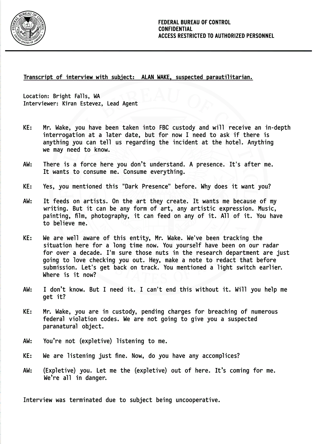 [ Estevez hands her the gray clipboard holder that contains the interview transcript with Alan Wake. Green eyes scan over the printed word and a frown deepens on her face.